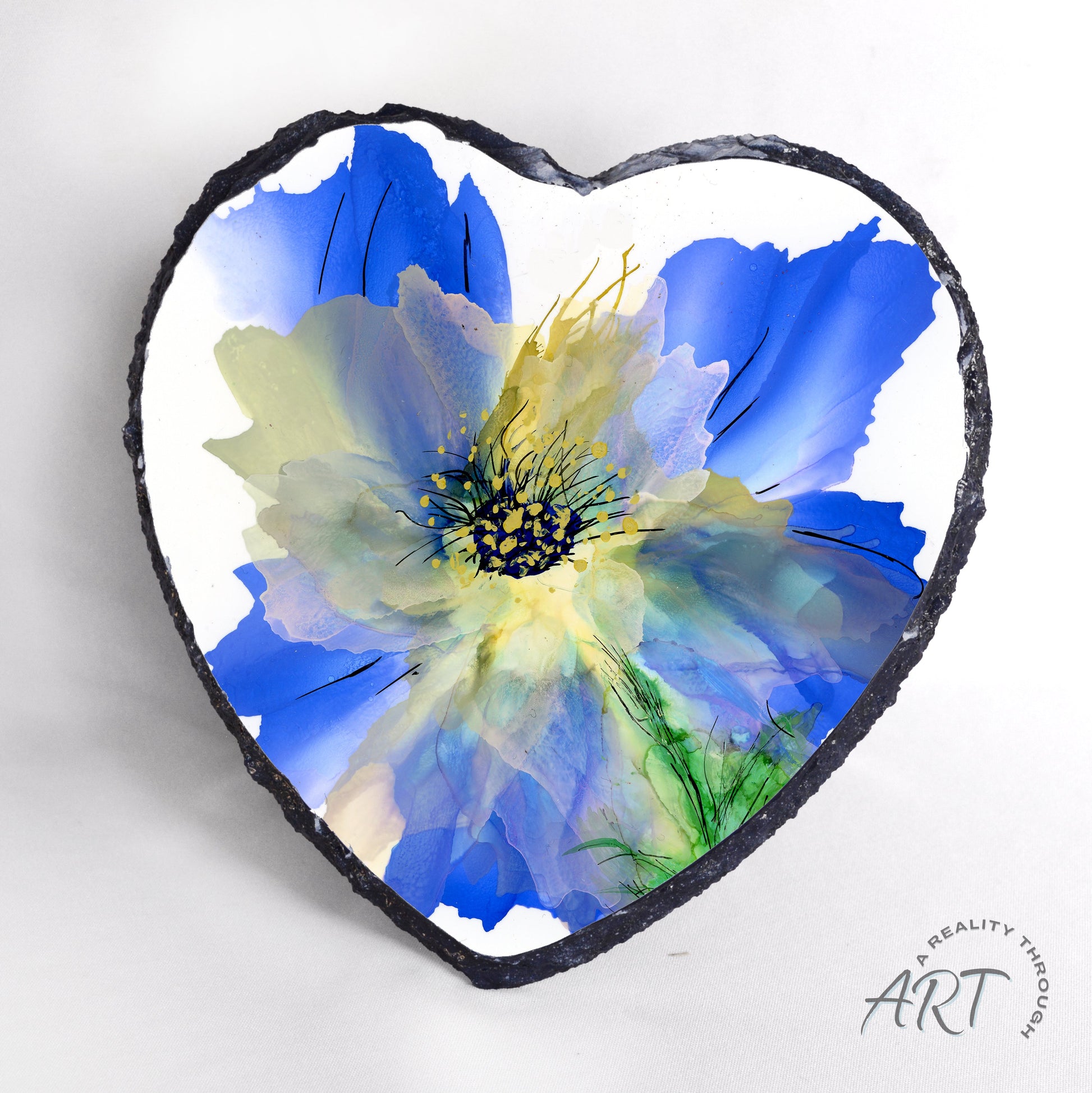 This charming approx. 6" heart-shaped slate features soothing alcohol ink florals in blue and gold. Heat safe and hand wash only. Includes soft silicone bumpers on the back to protect furniture surfaces. A sweet décor accent or hostess gift.