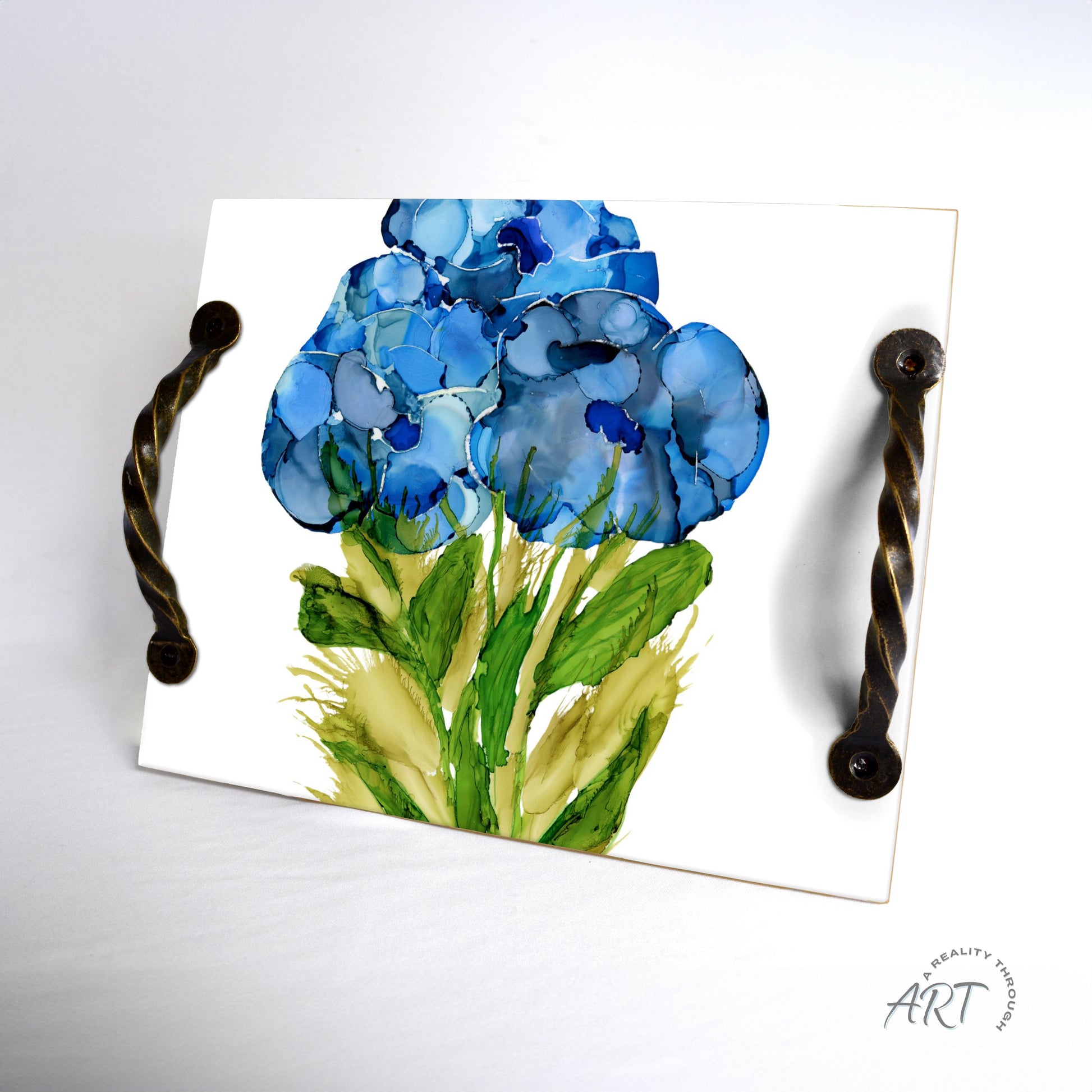 This 8"x10" ceramic tray pairs elegant twisted oil-rubbed bronze handles with a refreshing alcohol-ink blue floral bouquet. The vibrant blues and organic greens shine beautifully against the glossy ceramic, creating a natural focal point for kitchen décor or table displays. Perfect for wrapped treats, candles, mugs, decorative displays or beverage accompaniments. Heat safe and hand wash only. A charming botanical unique gift.