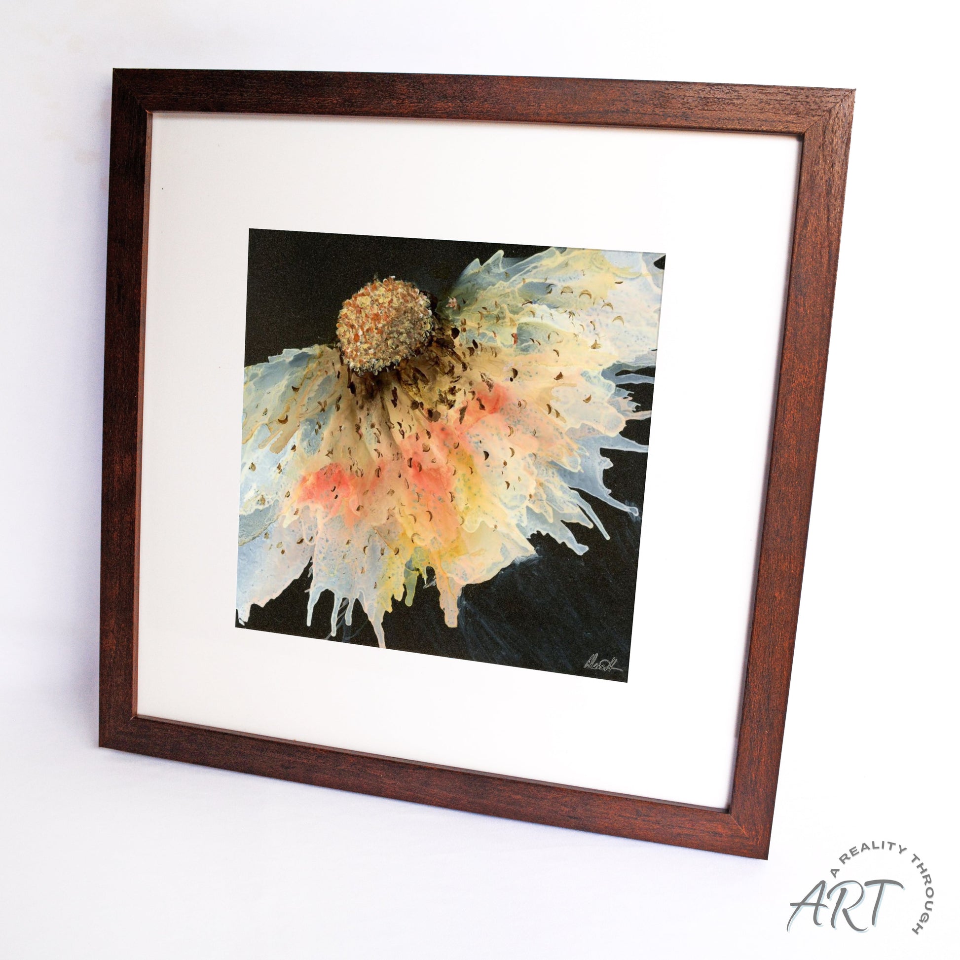 The walnut frame of this 12"x12" art print beautifully complements the artwork’s warm, organic palette. The 8"x8" archival matte print glows with soft peaches, creams, and misty blue tones that bring calm movement to any room.
