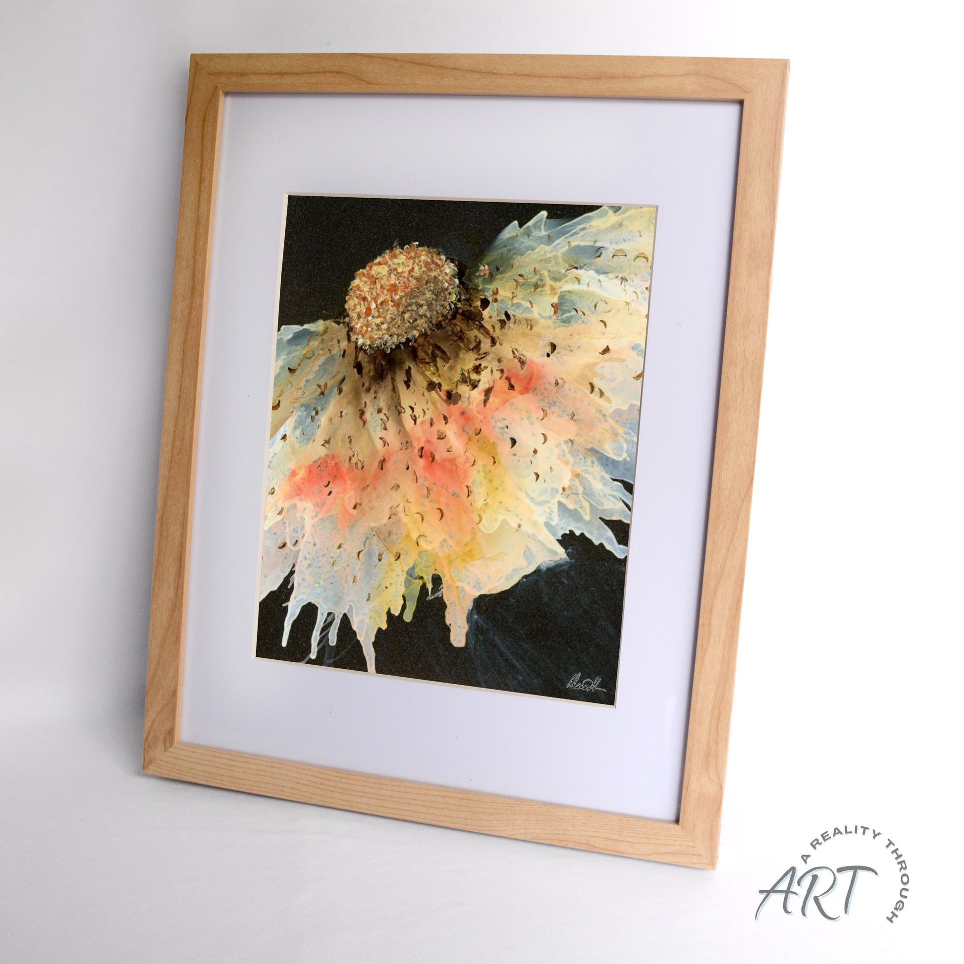 This 12"x15" alderwood-framed art print brightens your space with its soft, flowing alcohol ink petals and gently textured center. The 8"x10" archival matte reproduction glows warmly within the natural frame.