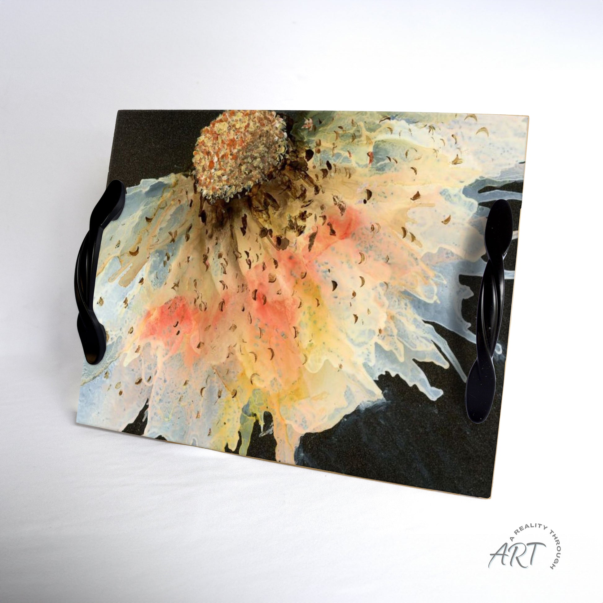 Sleek black hardware gives this 8"x10" ceramic tray a contemporary feel, contrasting beautifully with the warm, soft floral artwork. The flowing alcohol ink tones add depth and artistic charm.