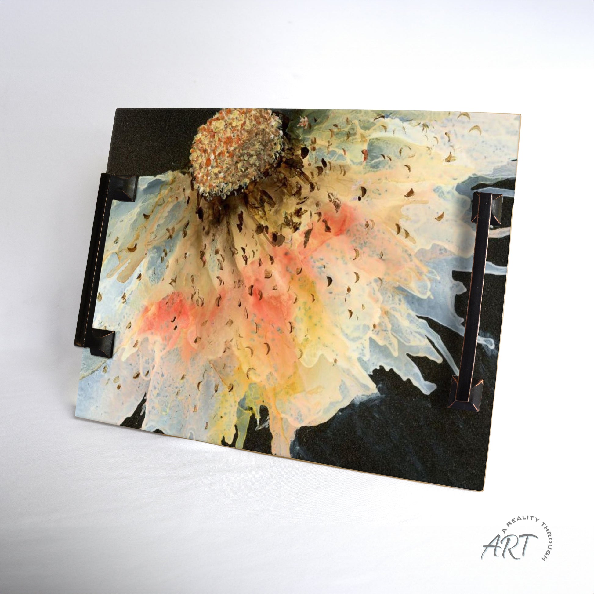 Classic square oil-rubbed bronze handles complement the organic warmth of this 8"x10" ceramic tray. The expressive alcohol ink artwork glows softly across the surface, creating a versatile and artistic display piece.