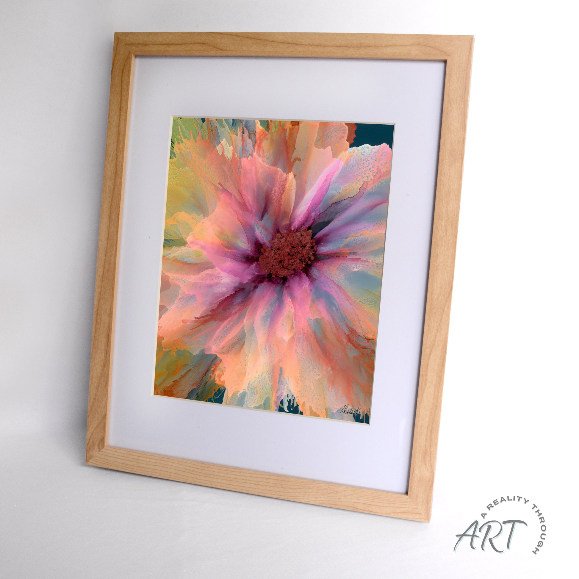 Airy and uplifting, this 12"x15" alderwood-framed art print highlights the bright, blooming energy of the alcohol ink artwork. The 8"x10" archival matte print glows with soft transitions and expressive color, creating the feeling of a flower captured mid-burst. The light alderwood frame enhances the sense of brightness and movement, making this piece perfect for kitchens, offices, bedrooms, or sunlit rooms. Finished with glass for polished clarity. A heartfelt unique gift for lovers of colorful, modern wall art. Art print shipping times may vary and can take up to 10 business days.