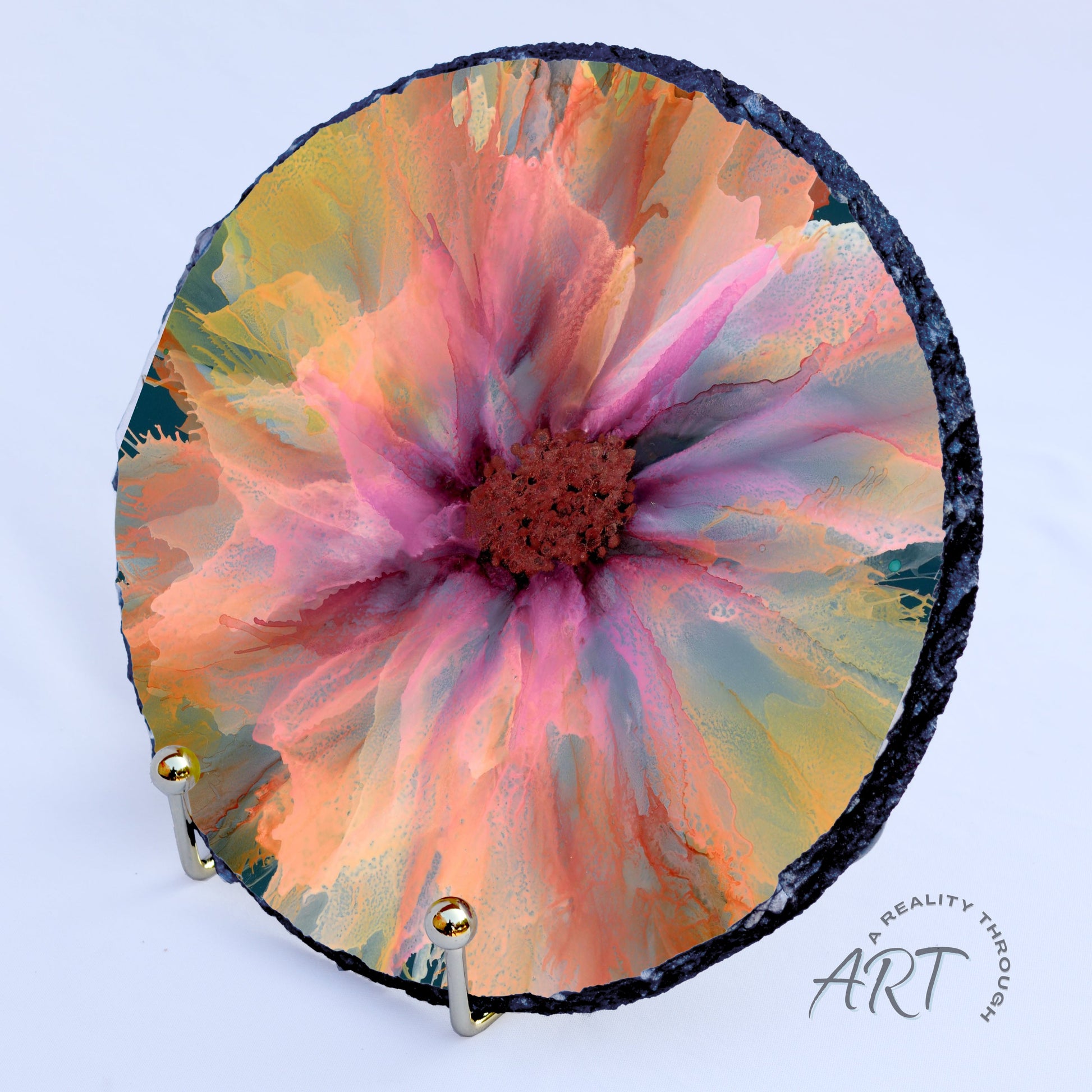 This 8" round slate trivet transforms your table into a canvas of vibrant, flowing alcohol ink artistry. The swirling pastels and bold florals radiate from the center like a blooming watercolor garden, giving every meal or gathering a touch of artistic elegance. Heat-safe natural slate makes this perfect for setting beneath hot pots, kettles, pans, or warm dishes, while protecting surfaces with style. Its round shape adds a soft, organic balance to the energetic color palette, making it equally suited for kitchen décor or coffee table art. Hand wash only for best longevity. A thoughtful and unique gift for lovers of functional art and modern home accents.