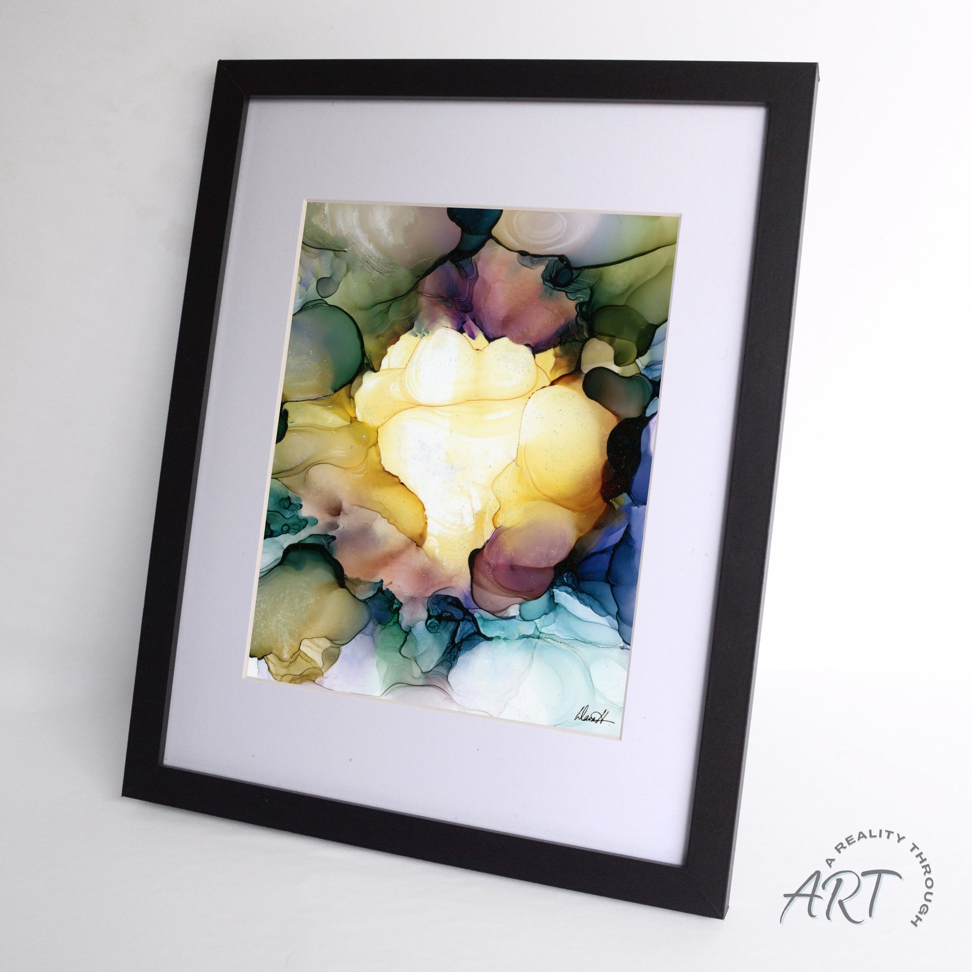 This 12"x15" black-framed art print showcases an 8"x10" archival matte alcohol ink reproduction behind glass, blending deep greens, warm golds, purples, and blues for a bold statement piece. Art print shipping times may vary and can take up to 10 business days.