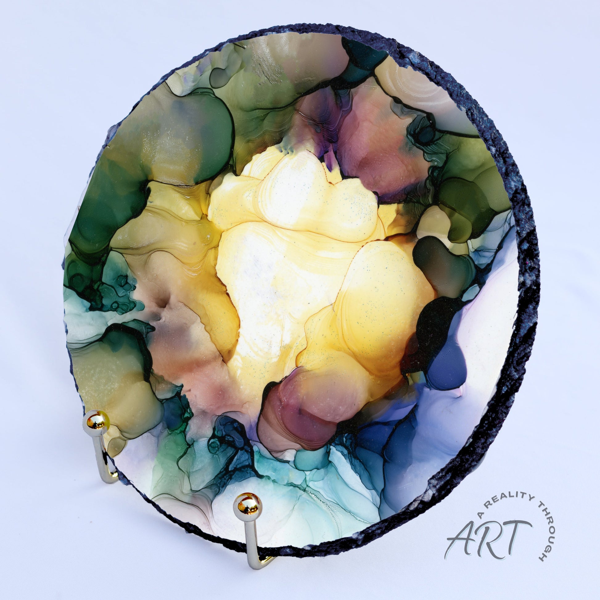 This 8" Round Slate Trivet showcases expressive alcohol ink art bursting with rich jewel tones and glowing amber hues. Heat-safe and hand wash only, it’s ideal for resting hot cookware, teapots, or serving dishes while adding elegance and color to your kitchen décor. A beautiful fusion of functional art and practicality.
