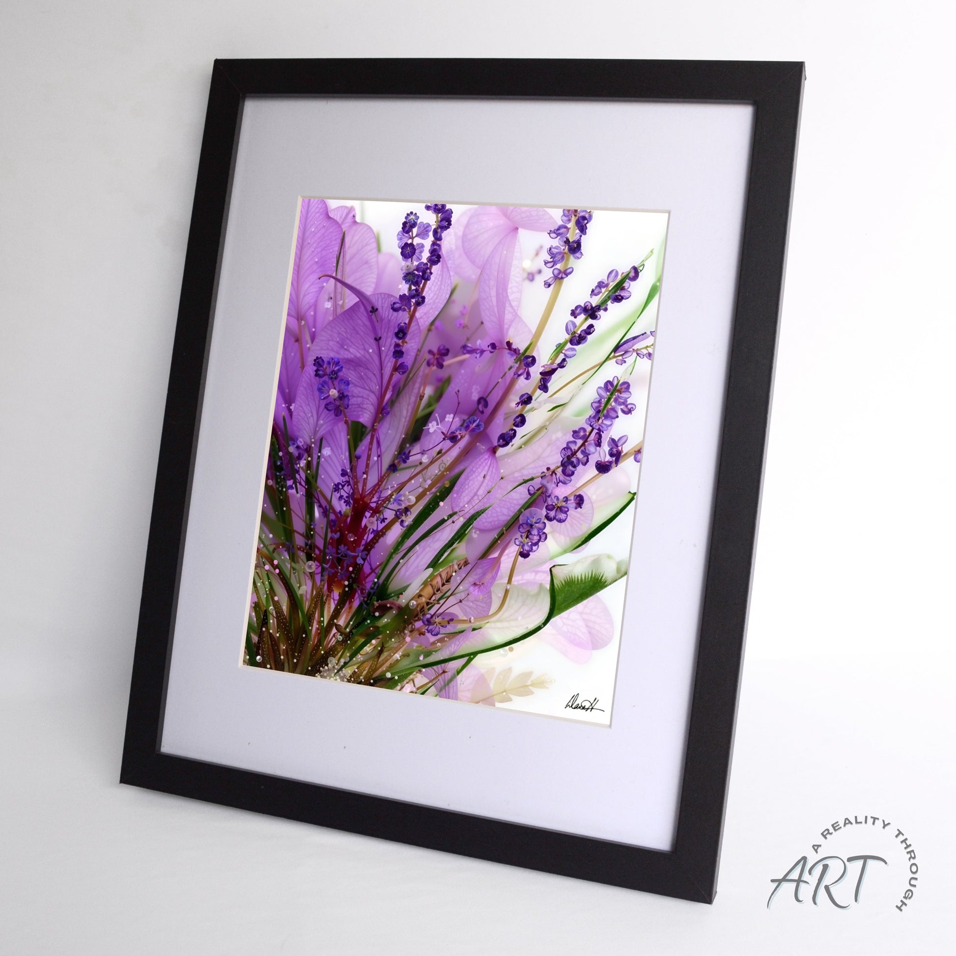 This 12"x15" black-framed print features an 8"x10" archival matte artwork of lavender petals and miniature violet blooms under glass. A striking statement piece. Art prints may take up to 10 business days to ship.