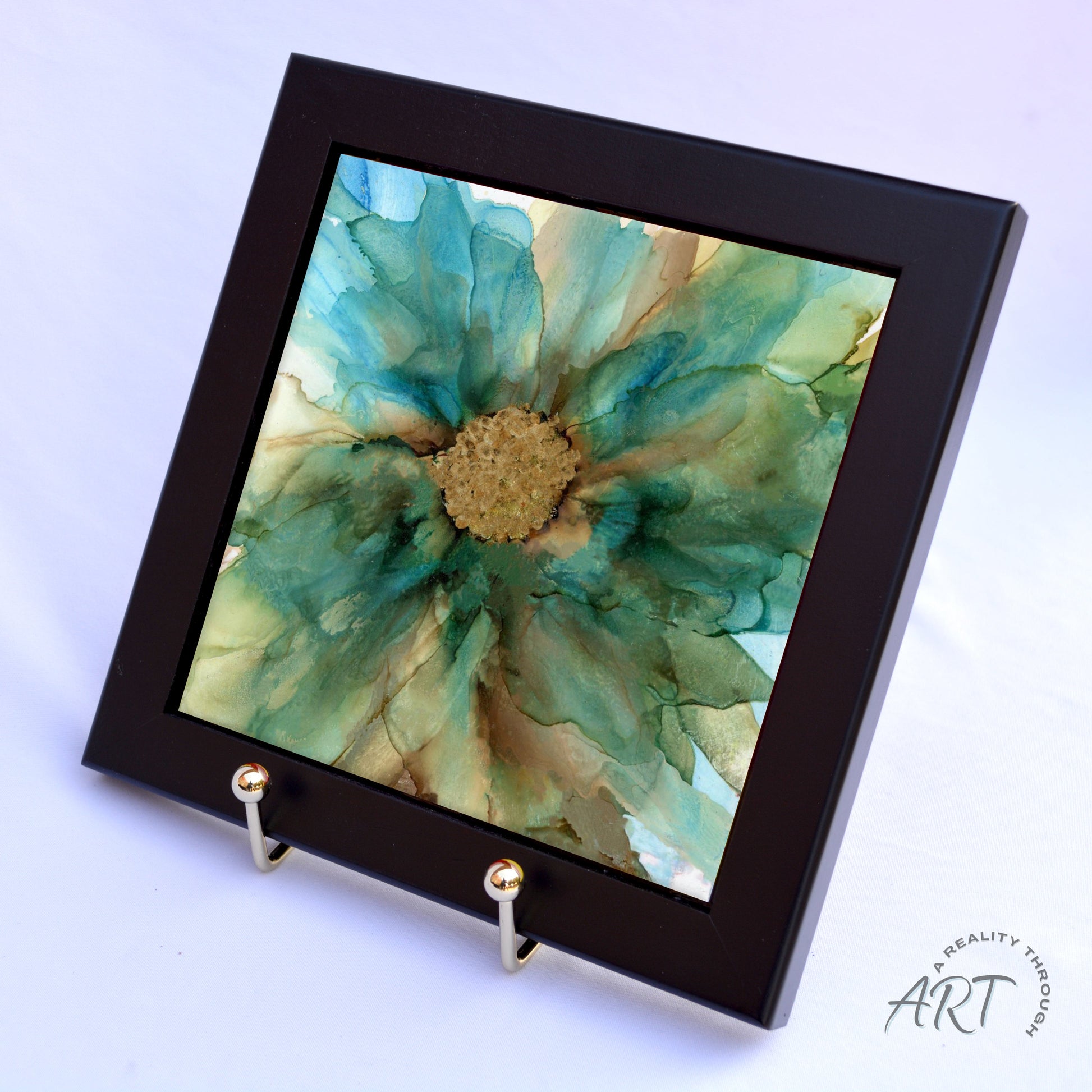 This 6"x6" ceramic tile framed in black wood captures the gentle flow of a coastal bloom with subtle teal, cream, and peach tones. High-resolution sublimation reveals every fluid detail, offering a calming focal point. Ideal for gallery walls, small spaces, or gifting to lovers of serene botanical art.
