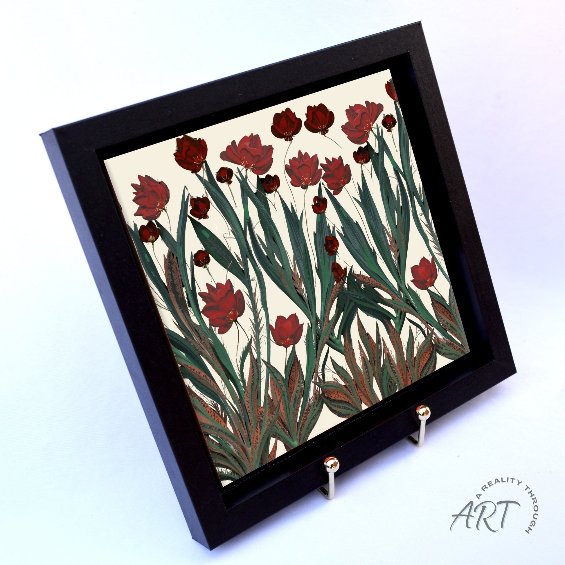 This 8"x8" framed ceramic tile becomes a moody botanical statement piece, showcasing deep red blossoms and layered greenery printed through high-resolution sublimation. Set inside a sleek black wood frame, it creates a gallery-worthy piece of framed wall art—perfect for adding atmospheric elegance to living rooms, hallways, or bedrooms. A stunning unique gift for anyone who loves dramatic floral décor.