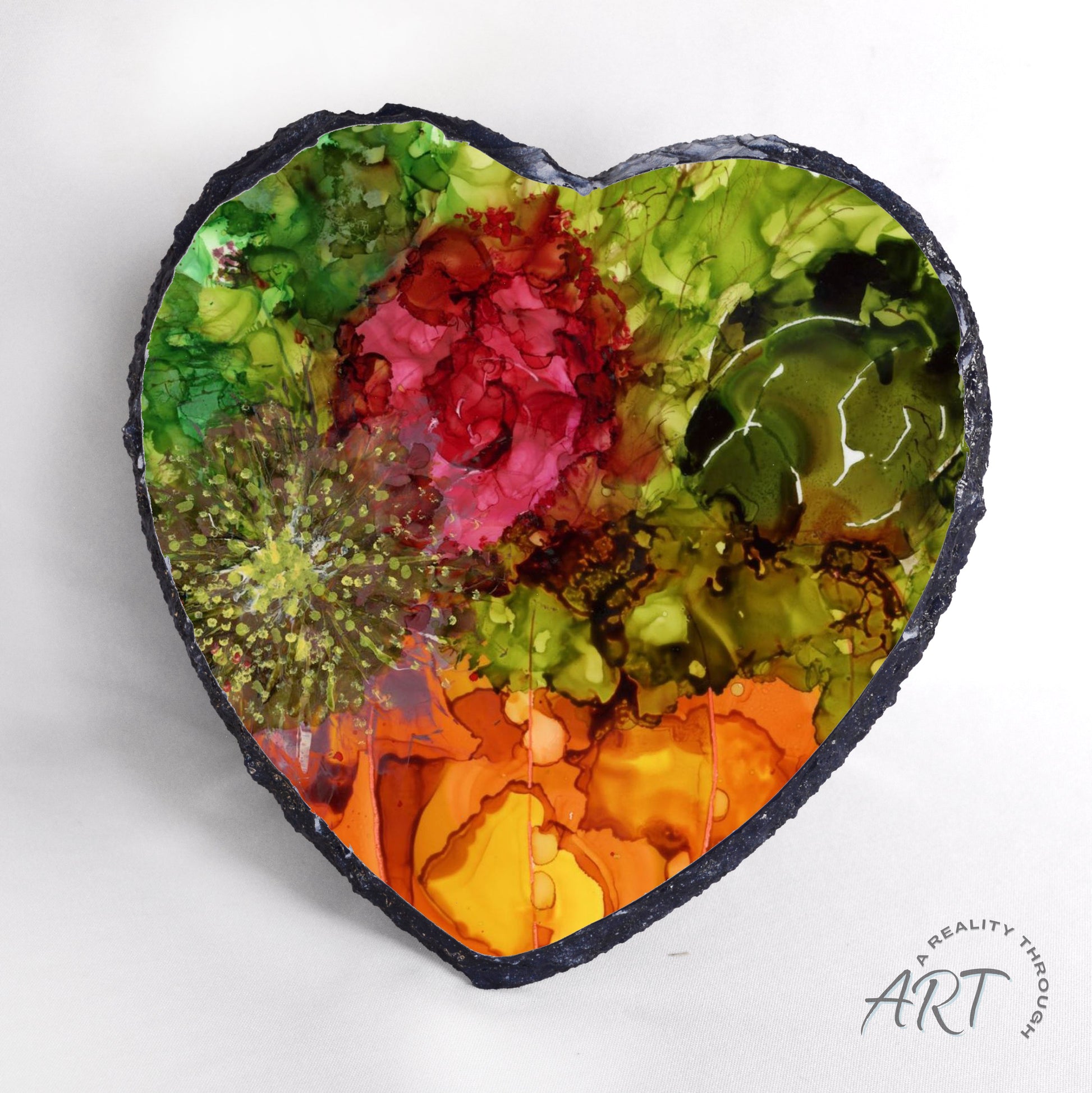 This heart-shaped slate piece showcases the rich autumn tones of a glowing pumpkin bouquet. Heat safe and hand wash only. Includes soft silicone bumpers on the back to protect the surface of furniture. A heartfelt seasonal décor accent.