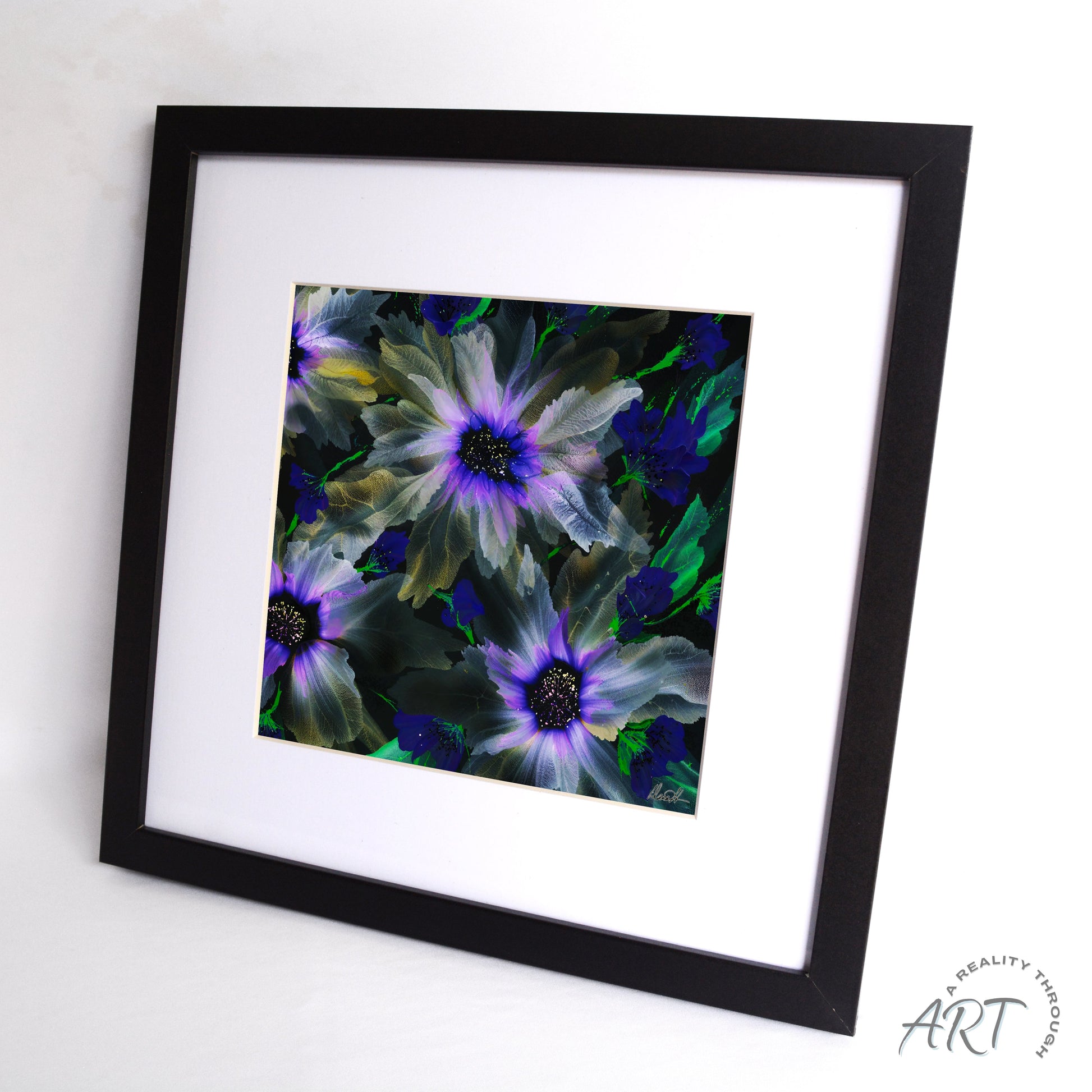 This 12"x12" black-framed art print features an 8"x8" archival matte reproduction of luminous purple petals set against an elegant black background. Finished under glass, the contrast creates a dramatic statement perfect for modern interiors and gallery-inspired walls. Art prints may take up to 10 business days to ship. A luxurious and unforgettable gift.