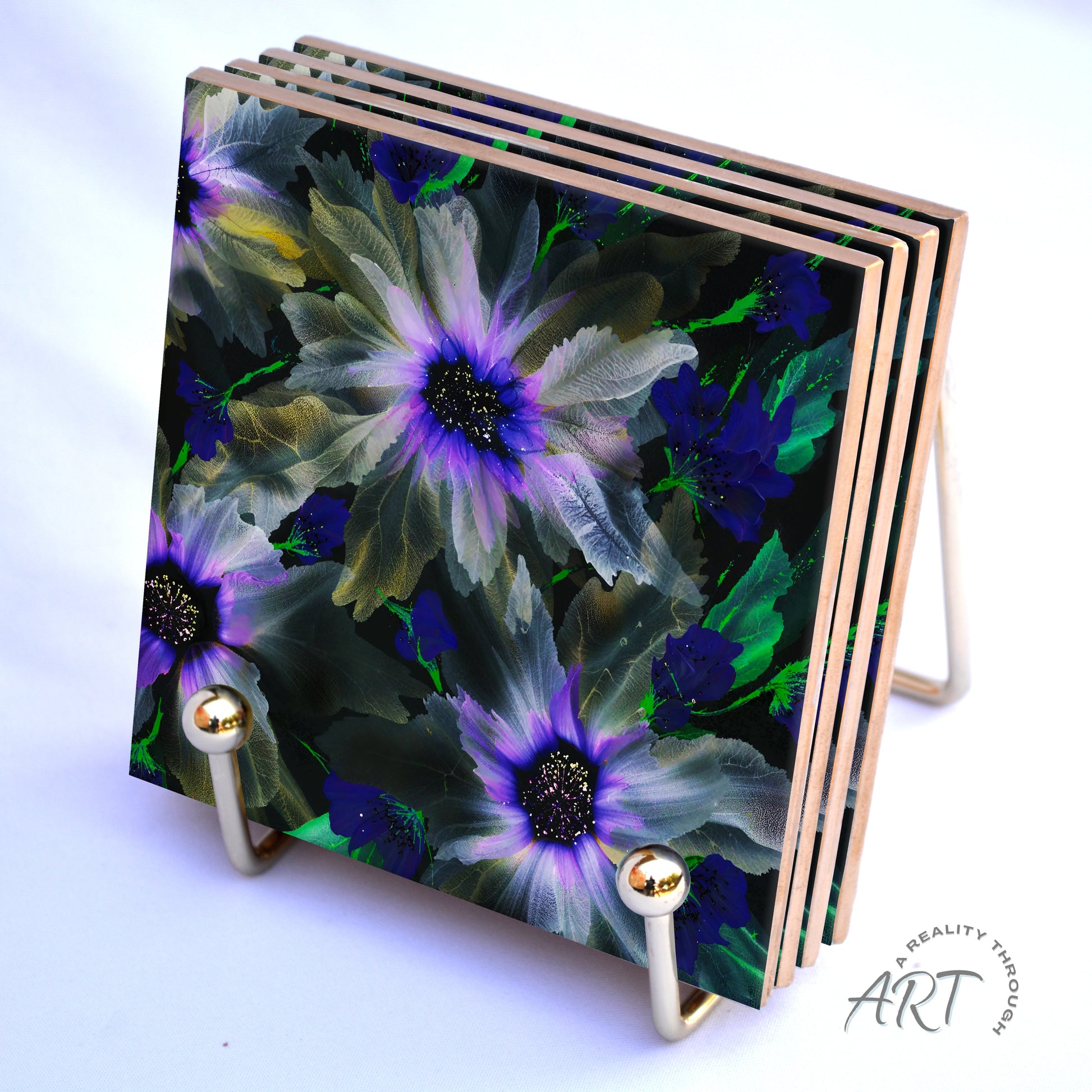 These ceramic coasters display glowing midnight florals printed in high-resolution clarity — radiant purples, smoky grays, shimmering silvers, and deep emerald accents. Heat-safe and visually stunning, they elevate any coffee table or bar setting. Includes holder. *Coaster holder type varies by availability.* Hand wash only. A luxe, unforgettable hostess gift.