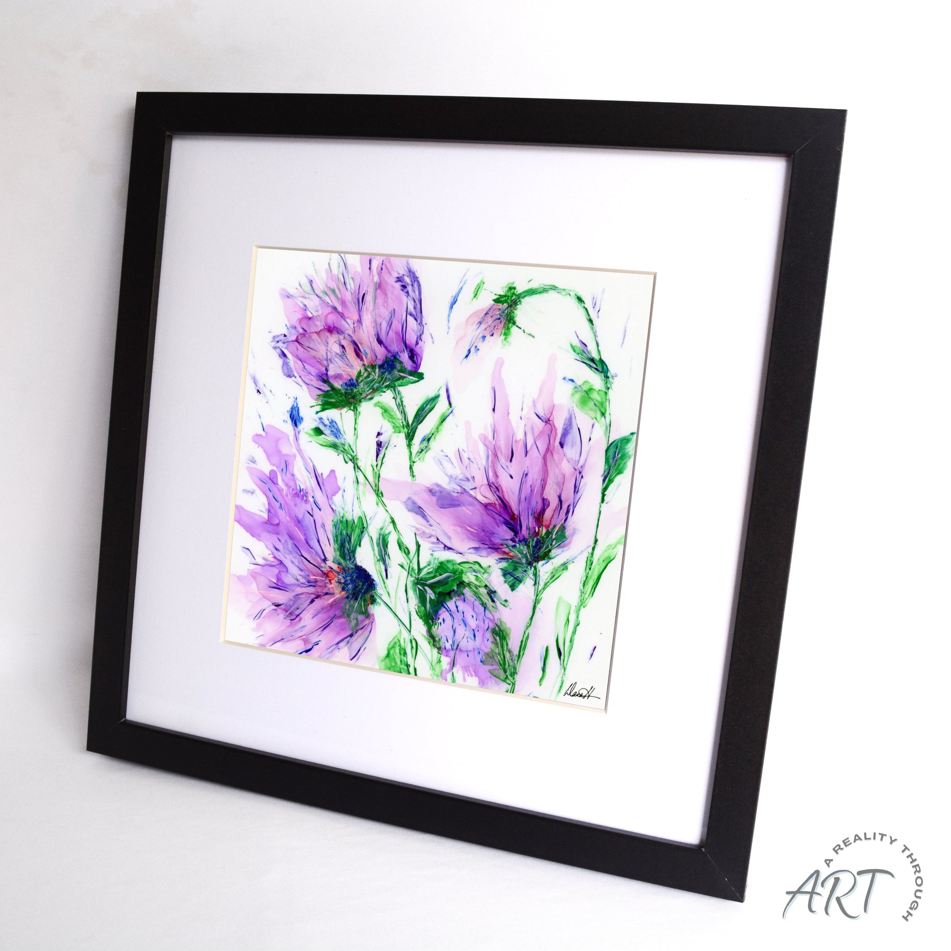 This 12"x12" black-framed art print features an 8"x8" archival matte artwork of violet petals and bright green leaves. Finished under glass with a sleek black frame, it brings natural elegance to kitchens, hallways, and living spaces. Art prints may take up to 10 business days to ship. A beautiful garden-inspired gift.