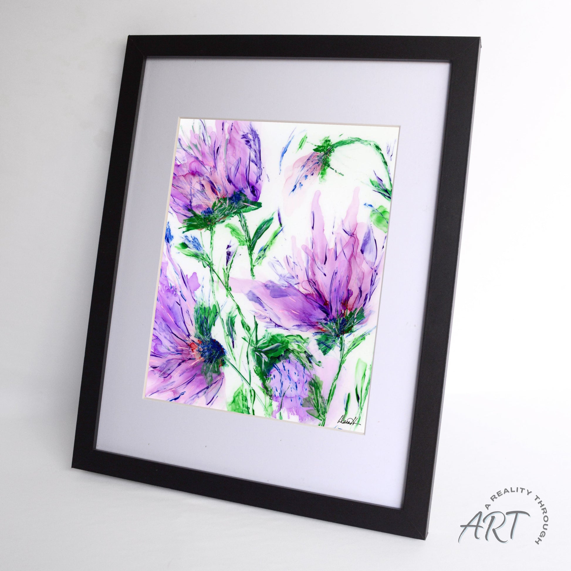 A lush display of violet petals and green stems fills this 8"x10" archival matte print, framed in bold black for striking contrast. This 12"x15" wall art piece adds a crisp botanical statement to kitchens, hallways, or gallery walls. Finished under glass. Art prints may take up to 10 business days to ship. A serene and nature-filled gift.