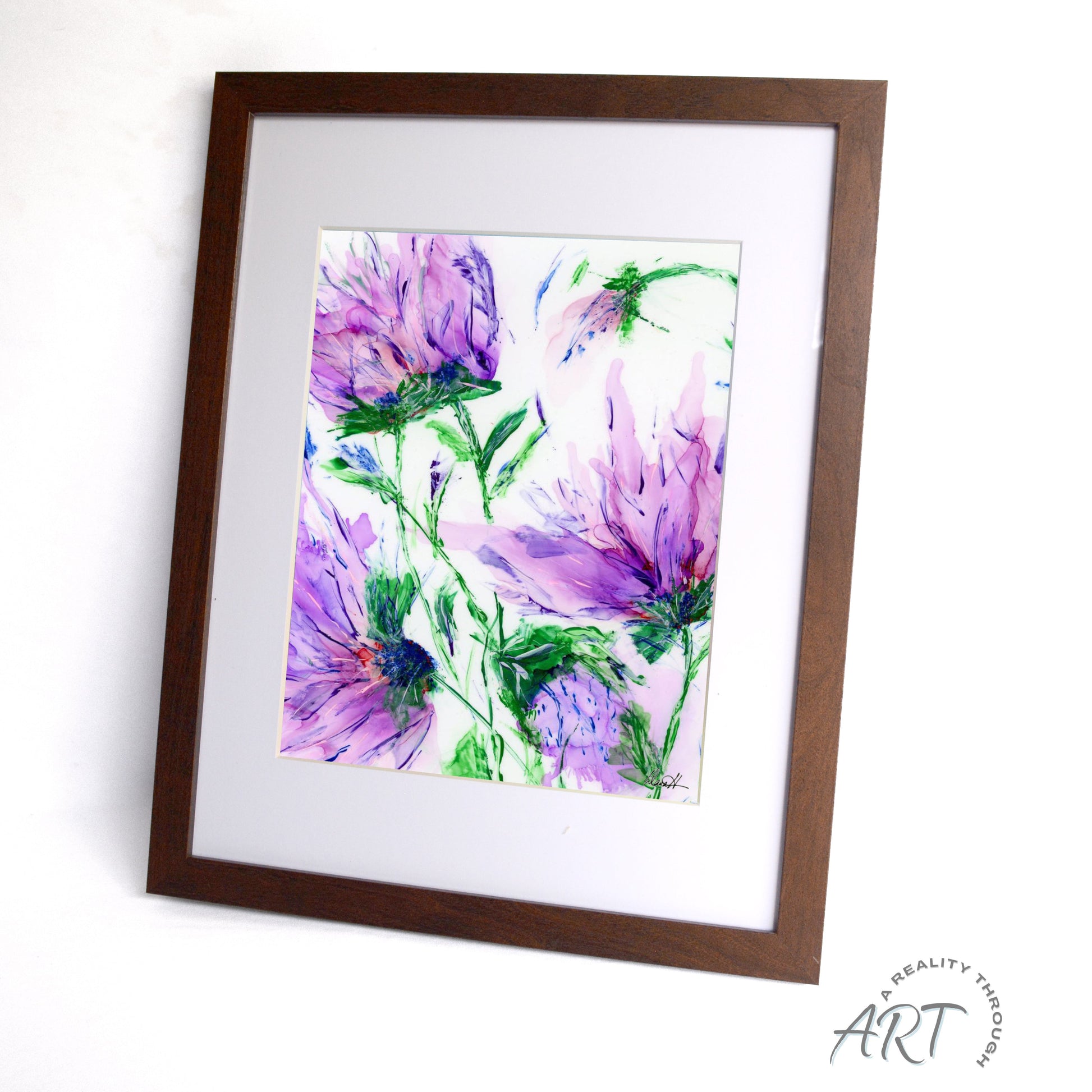 Warm walnut wood complements the flowing purples and lively greenery of this 12"x15" framed artwork. The archival matte print creates a soft, garden-fresh focal point ideal for rustic or nature-inspired décor. Finished under glass. Art prints may take up to 10 business days to ship. A beautiful botanical gift.