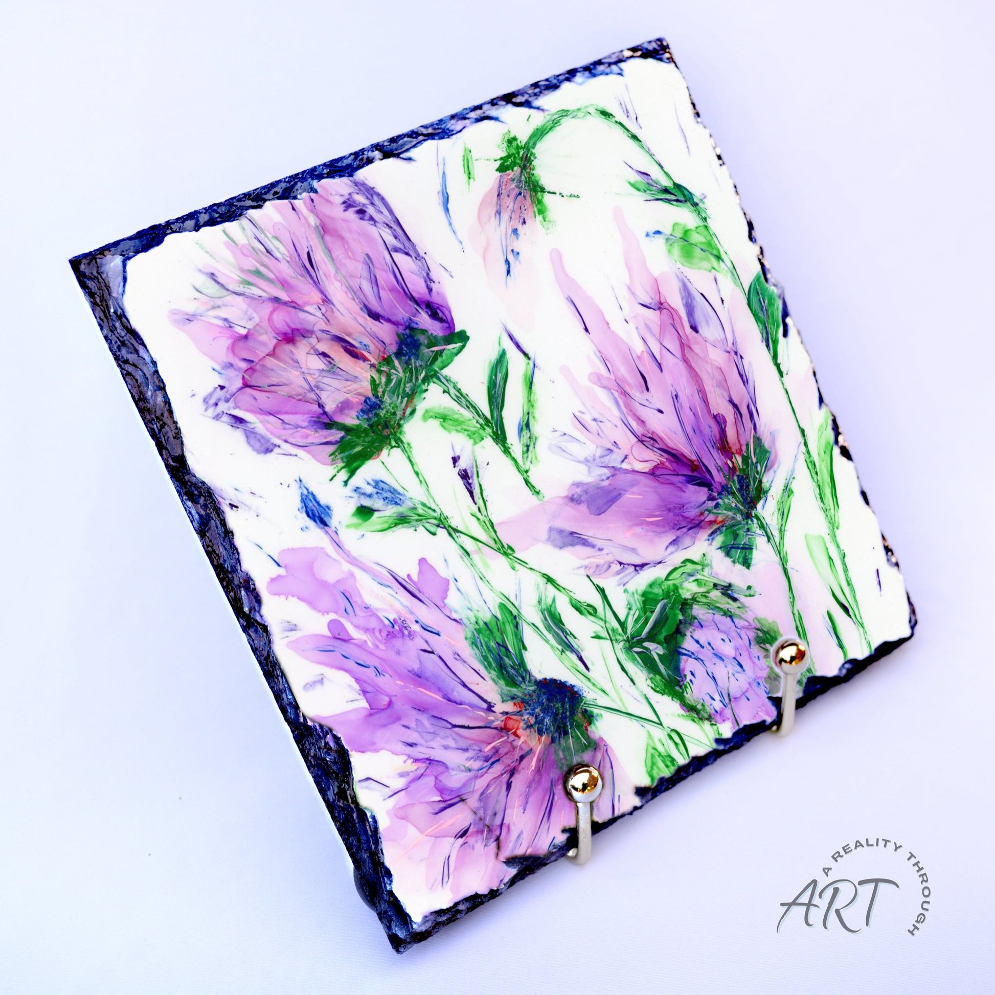 Bring the beauty of a blooming garden into your kitchen with this 8" square slate trivet featuring soft, flowing violet petals and fresh green stems captured in alcohol ink. The natural stone surface is heat-safe, perfect for placing beneath hot pots, warm dishes, and tea kettles while protecting your counters. Hand wash only. A refreshing blend of botanical charm and functional art, making it an ideal housewarming or hostess gift.