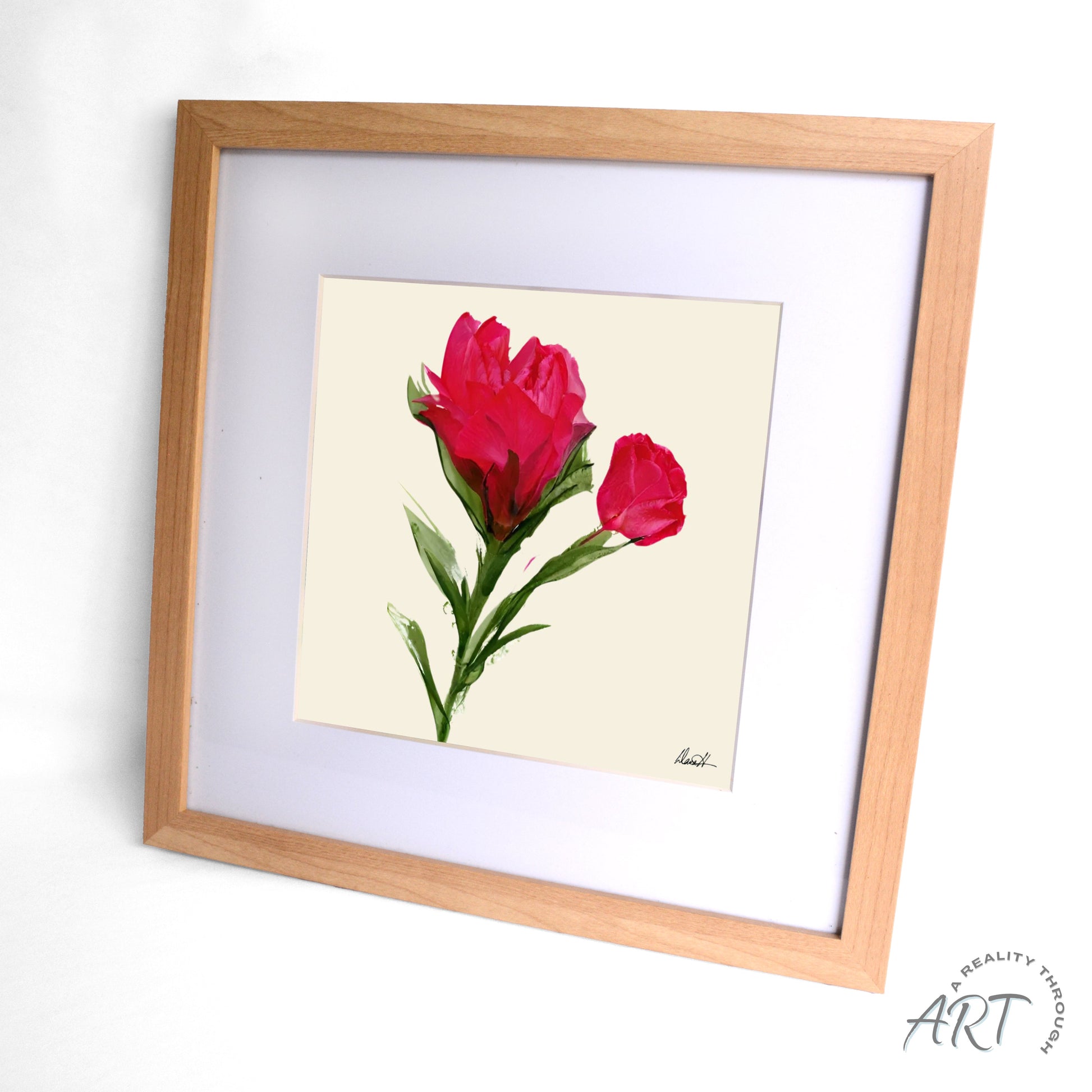 Bright and refreshing, this 12"x12" art print framed in light alderwood brings cheerful floral energy to any room. The 8"x8" archival matte artwork features a vivid red bloom painted in flowing alcohol-ink strokes, full of movement and life. The alderwood frame gives the piece an airy, natural feel—perfect for kitchens, studios, bedrooms, or sunlit walls. Finished with glass. A beautiful unique gift bursting with joyful color. Please allow up to 10 business days for shipping.