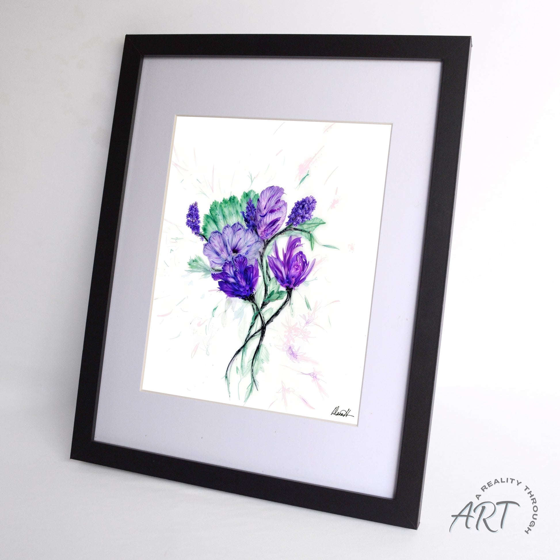 This 12"x15" black-framed art print showcases the full elegance of the purple bloom composition, printed crisply on archival matte paper and finished with protective glass. A bold centerpiece for living rooms, offices, or hallways. Art prints may take up to 10 business days to ship.