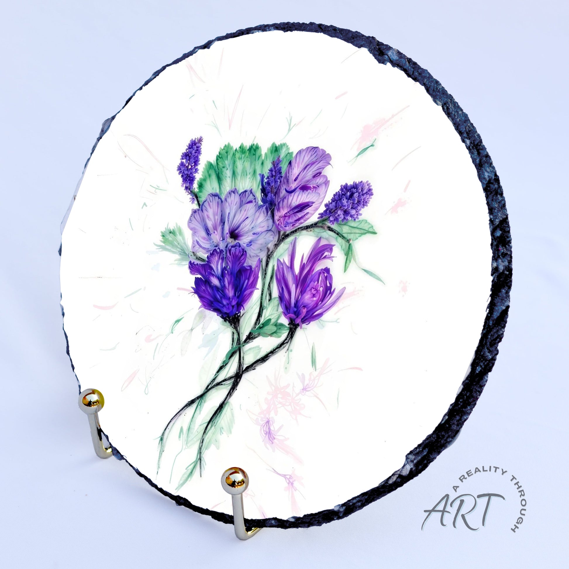 This 8" round slate trivet showcases a graceful bouquet of purple alcohol ink florals, pairing vibrant art with essential kitchen function. Designed to hold hot pots, kettles, or dishes, it keeps surfaces protected while adding a pop of color and elegance. Heat safe and hand wash only. A beautiful balance of functional art and thoughtful gifting.