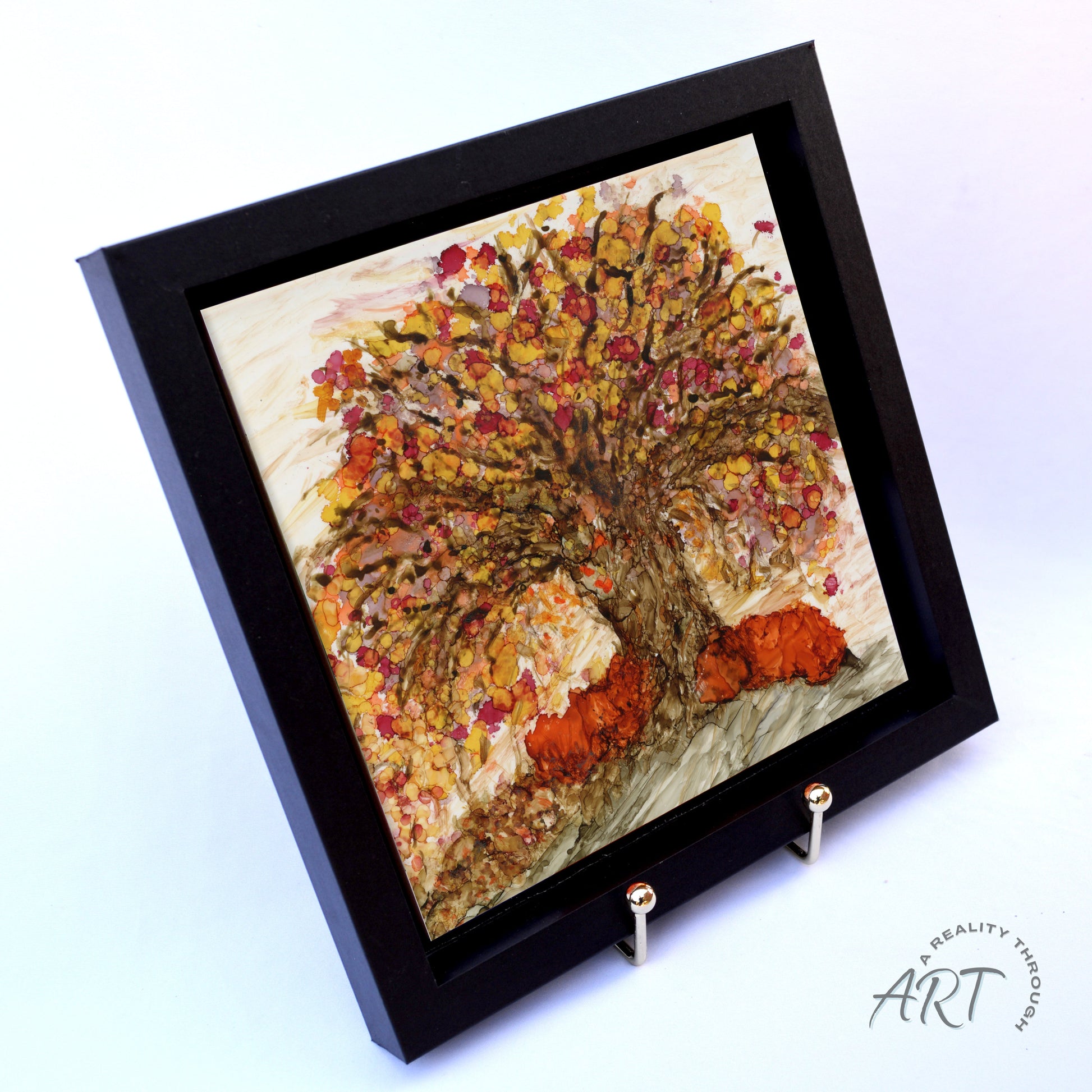 This 8"x8" framed ceramic tile transforms your wall into a warm autumn landscape, showcasing an alcohol-ink tree alive with glowing fall color. High-resolution sublimation highlights every golden leaf and textured bark detail, creating rich, earthy framed wall art. The black wood frame adds crisp contrast that makes the artwork feel bold and inviting. Perfect for cozy living rooms, rustic kitchens, or seasonal gallery walls. A comforting unique gift or fall-themed housewarming treasure.