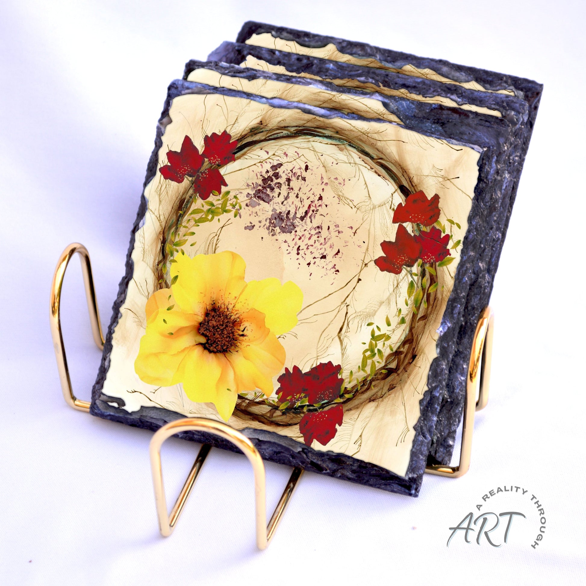 Add warmth and charm to your table with this set of 4"x4" slate coasters, each featuring a vibrant alcohol ink floral wreath with golden yellow and rich red blooms. The natural slate edges create a rustic feel while protecting your surfaces from heat and condensation. Food safe, heat safe, and hand wash only, these coasters come with a holder for easy storage and display. Perfect as floral coasters, coffee table art, or a housewarming gift, they bring both practicality and joy to gatherings.