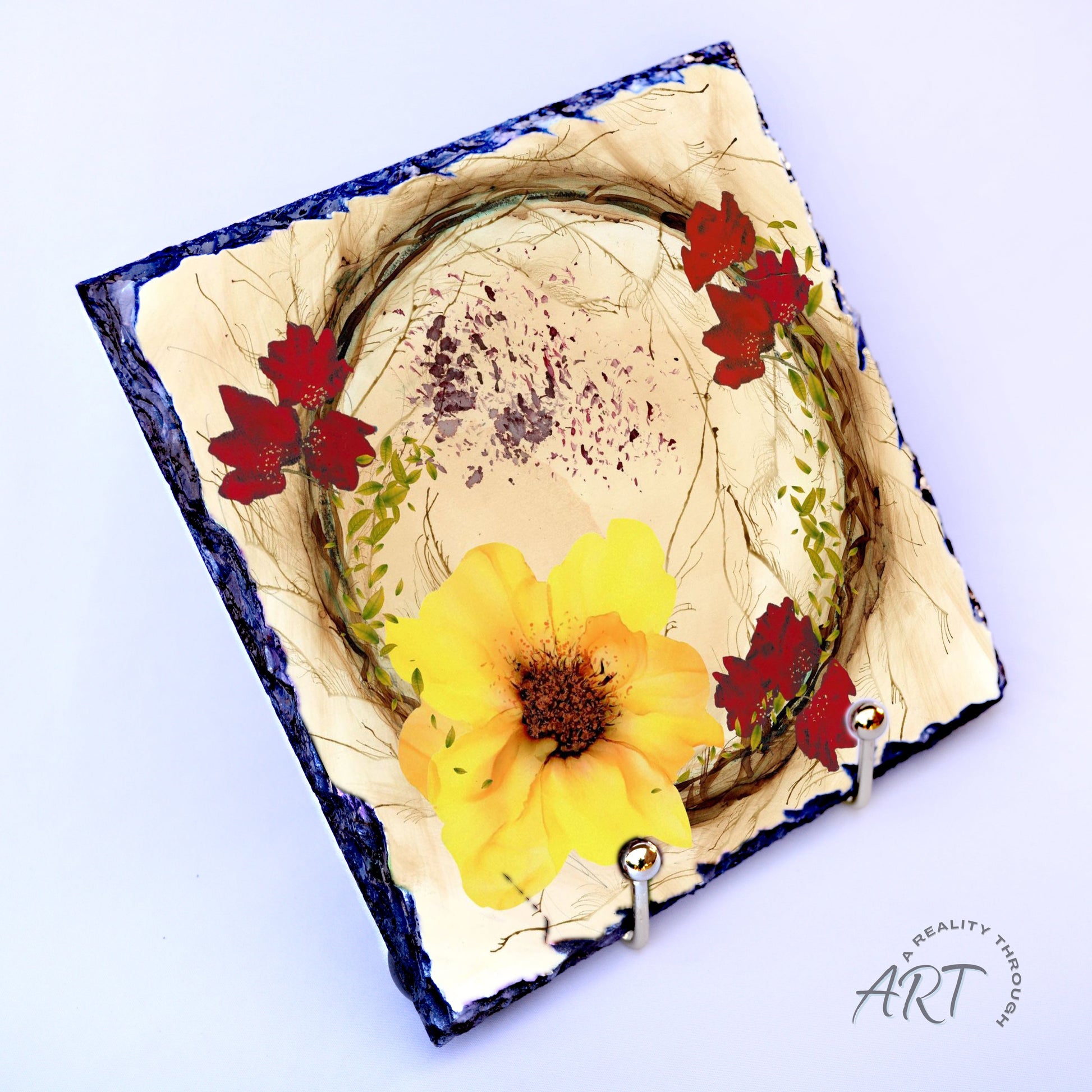 Protect your surfaces in style with this 8" square slate trivet, showcasing a radiant alcohol ink floral wreath. A bold yellow bloom takes center stage, surrounded by deep red flowers and leafy accents, all set against a warm, textured background. A trivet is designed to guard your tables and countertops from hot pots, pans, or serving dishes—making this both a practical kitchen accessory and a piece of functional art. Food safe, heat safe, and hand wash only, this trivet is perfect as a hostess gift or housewarming gift, blending everyday utility with artistic beauty.